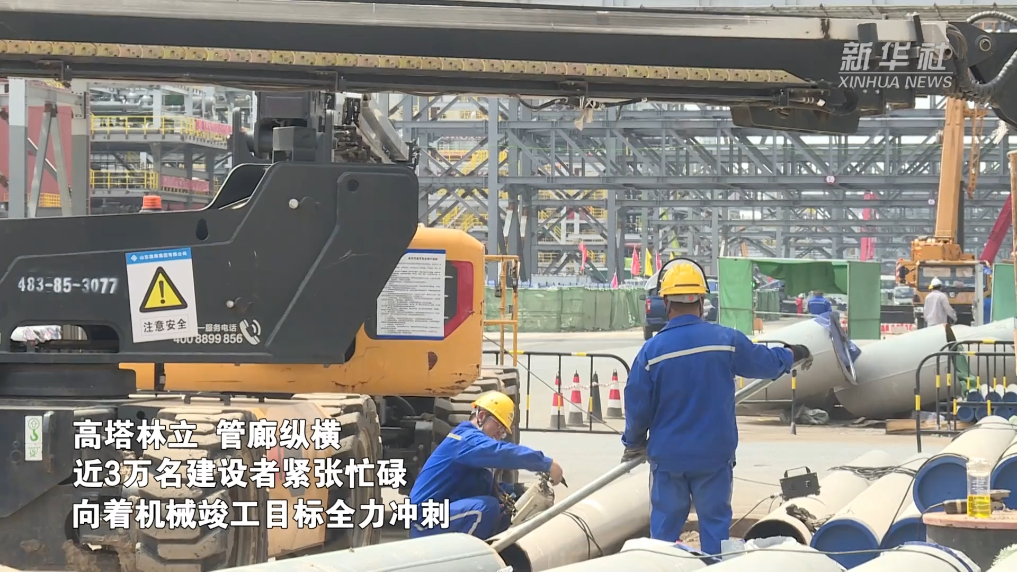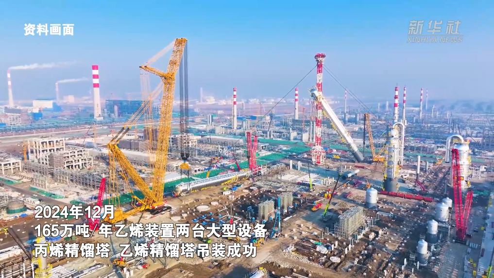 自开工之日起,项目稳步推进。2023年9月,完成所有地下工程施工;2024年12月,165万吨/年乙烯装置两台大型设备丙烯精馏塔、乙烯精馏塔吊装成功;2025年2月,项目中最大的单体设备——芳烃联合装置抽余液塔吊装成功。