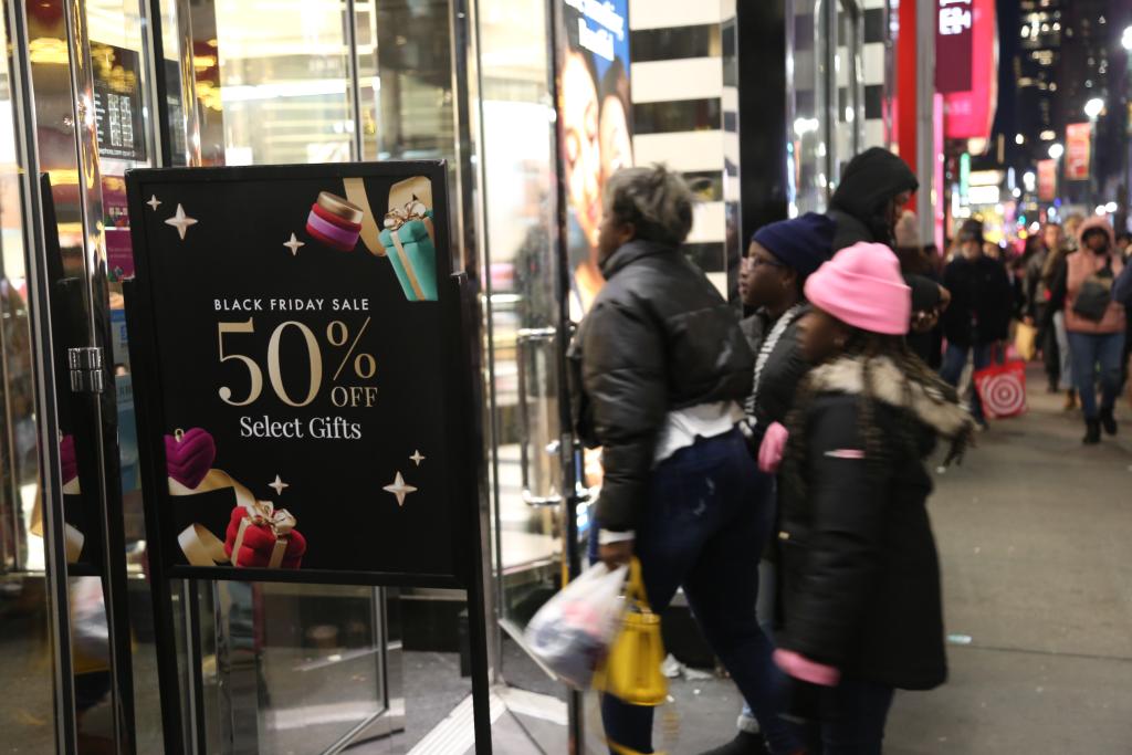 2024年11月29日,在美国纽约曼哈顿岛的一家商场外,人们经过“黑色星期五”促销广告牌。新华社记者刘亚南摄