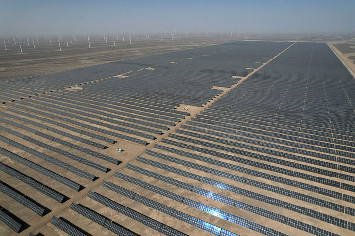 这是3月7日在酒泉市境内拍摄的瓜州昊华新能源电力有限公司20万千瓦光伏发电项目。新华社记者 张睿 摄