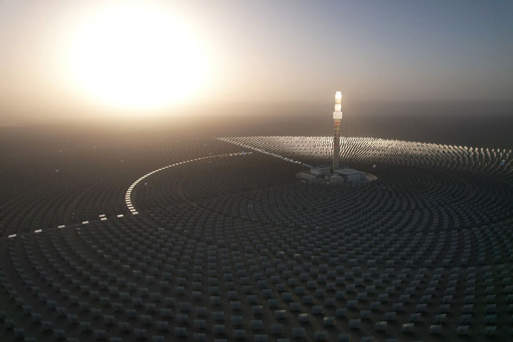这是3月7日在敦煌光电产业园区拍摄的首航高科敦煌100兆瓦熔盐塔式光热电站。新华社记者 张睿 摄