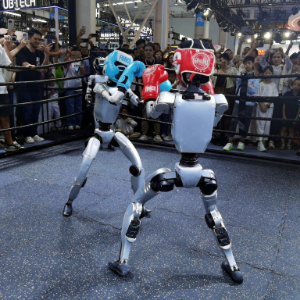 8月8日,宇树科技人形机器人在2025世界机器人大会上进行格斗表演。新华社记者 彭韵佳 摄