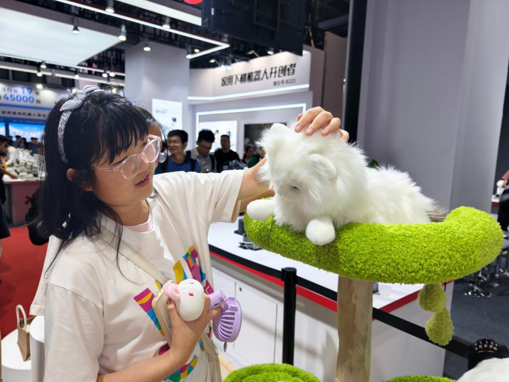 8月8日,小观众在2025世界机器人大会的大象机器人展台与仿生陪伴机器猫互动。新华社记者 温竞华 摄