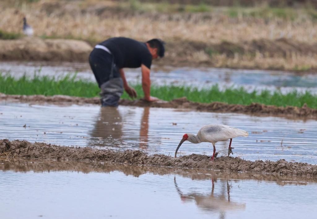 2025年5月,洋县云阳村的村民在田间劳作,朱鹮在周围觅食。(段文斌 摄)