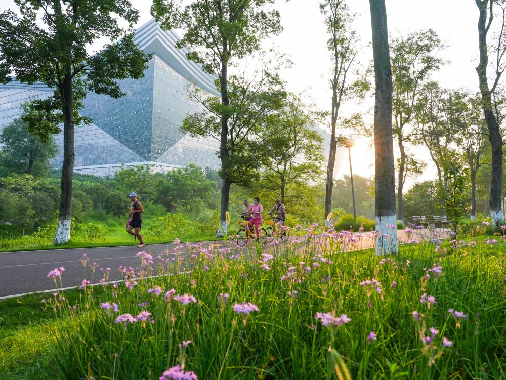 ↑市民在成都市锦城湖公园晨练骑行(2025年8月1日摄)。