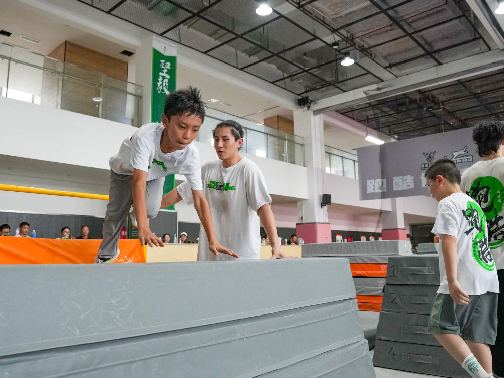 ↑在成都一家跑酷训练基地,青少年在练习跑酷(2025年8月5日摄)。