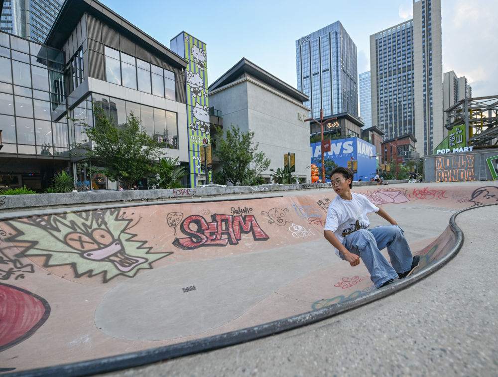 ↑在成都铁像寺水街,一位母亲带着儿子在玩滑板(2023年7月14日摄)。