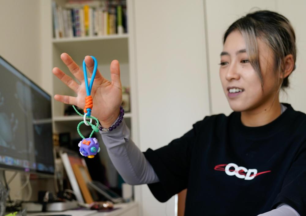 ↑吴庆文展示自己设计的攀岩文创挂件(7月27日摄)。