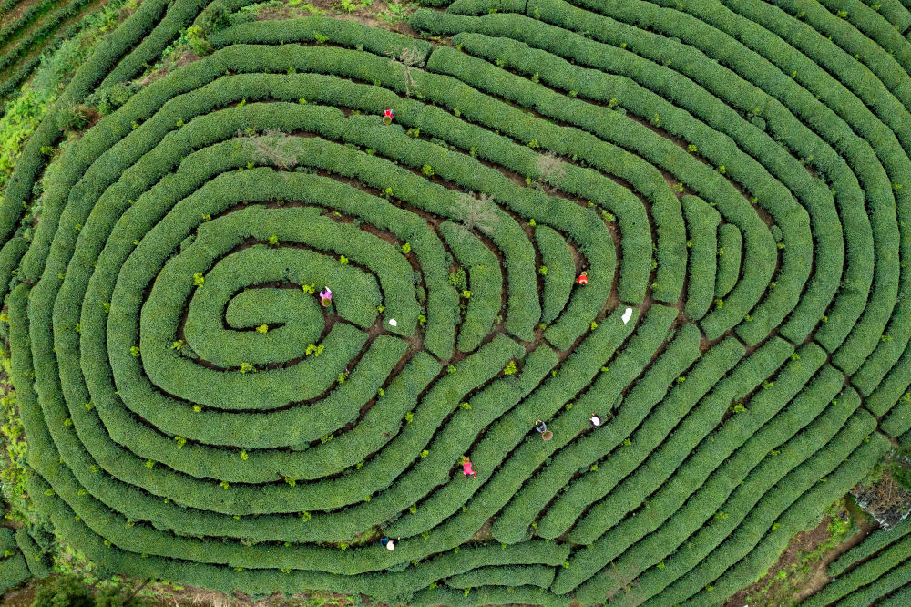 ↑茶农在雅安市蒙顶山上的茶园采摘茶青(2025年3月30日摄,无人机照片)。