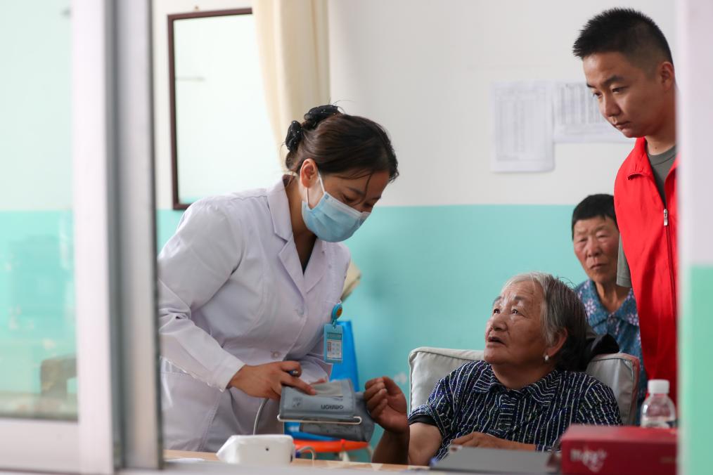8月9日,在榆中县第三中学安置点医疗点,医护人员为受灾人员量血压。新华社记者 郎兵兵 摄