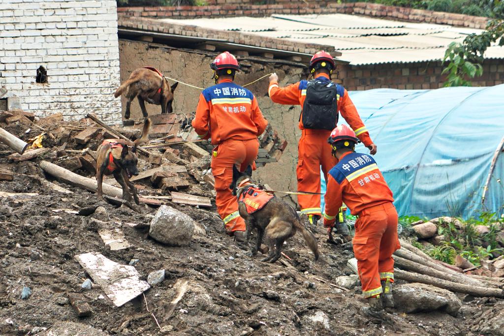 8月9日,甘肃省森林消防总队消防员在榆中县马坡乡旧庄沟村利用搜救犬搜救。新华社发(甘肃省森林消防总队供图)