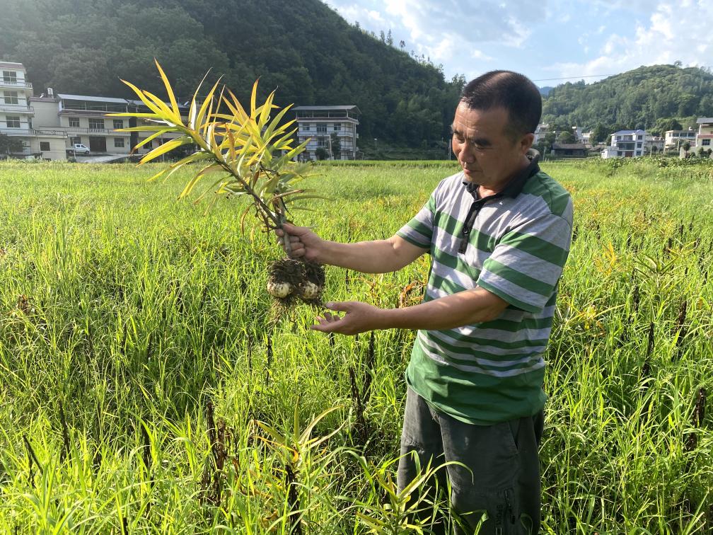 龙山县石牌镇上母村种植大户张光昭展示刚从地里挖出的百合鲜果。新华社记者柳王敏 摄