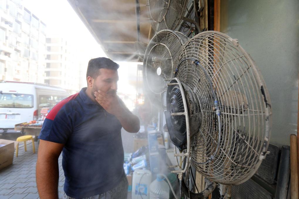 7月2日,在伊拉克巴格达,一名男子在街头吹电扇降温。新华社发(哈利勒·达伍德摄)