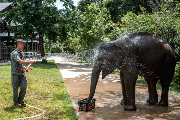在云南省西双版纳亚洲象救护与繁育中心,“象爸爸”王波给“羊妞”冲凉(8月10日摄)。