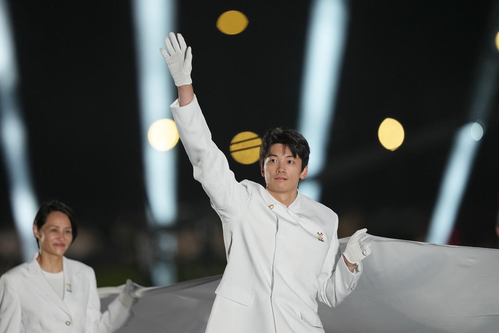 8月7日,国际奥林匹克委员会会旗执旗手汪顺(右)在第12届世界运动会开幕式上。新华社记者 刘坤 摄