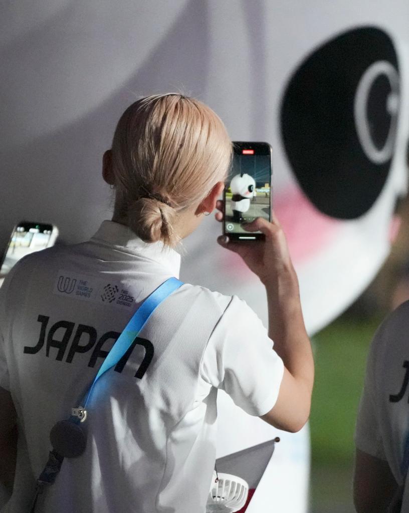 2025年8月7日,一名日本体育代表团成员在开幕式上拍摄吉祥物“蜀宝”。当日,第12届世界运动会开幕式在成都举行。新华社记者 胥冰洁 摄