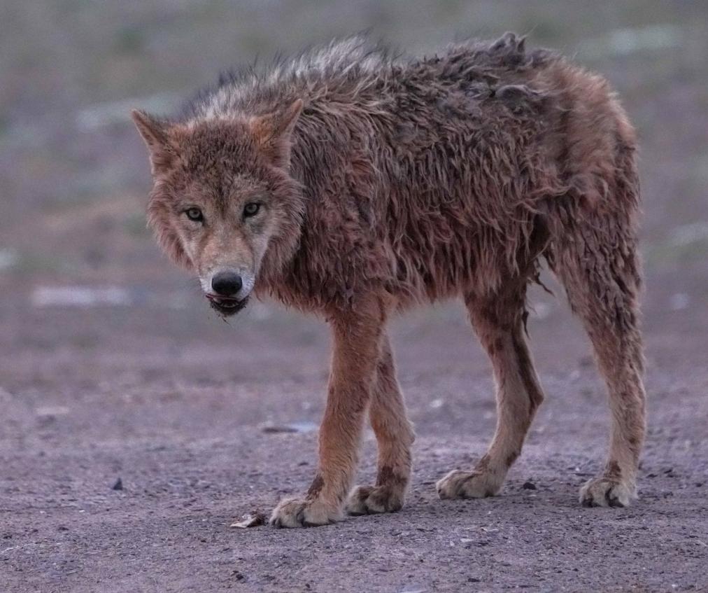 这是一只成年的狼,瘦瘦的,黄色的底毛上夹杂着灰色和黑色的毛,根根都像竖起来一样,隔老远就让人感到扎手。只见它不慌不忙,和人保持大约10米的距离,眼睛却一直盯着大家,目光温顺,一点都看不出凶的样子,和家里养的狗没啥两样。