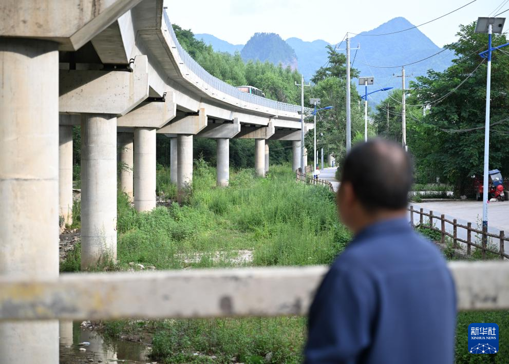 在甘肃省天水市麦积区麦积镇麦积村,牟常有站在高架桥下眺望远方的麦积山(7月16日摄)。