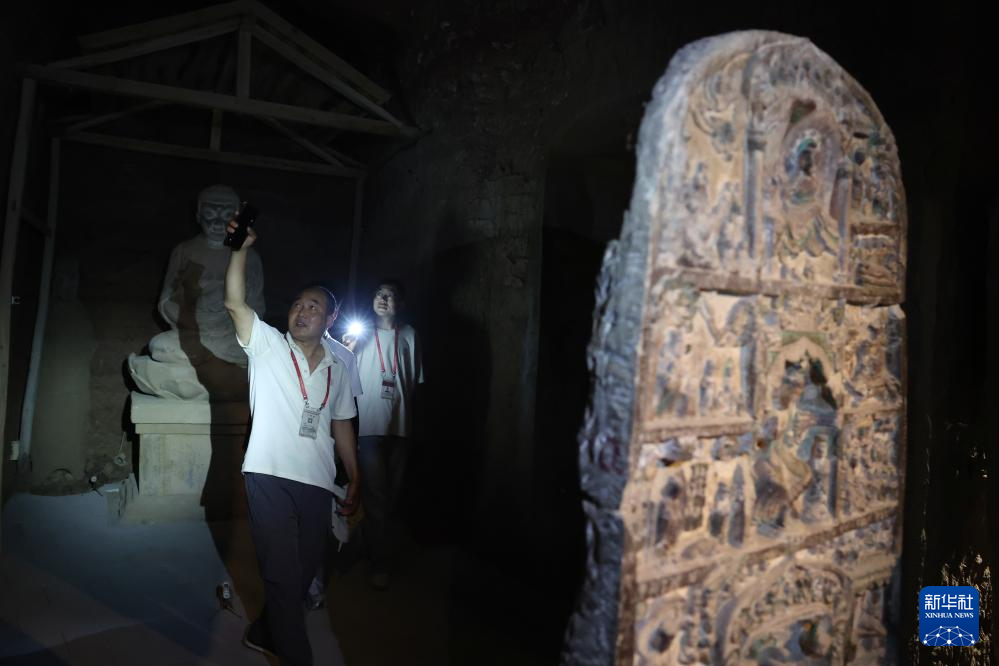 牟常有带着年轻的文物修复师在麦积山石窟133窟内查看塑像和壁画(7月16日摄)。