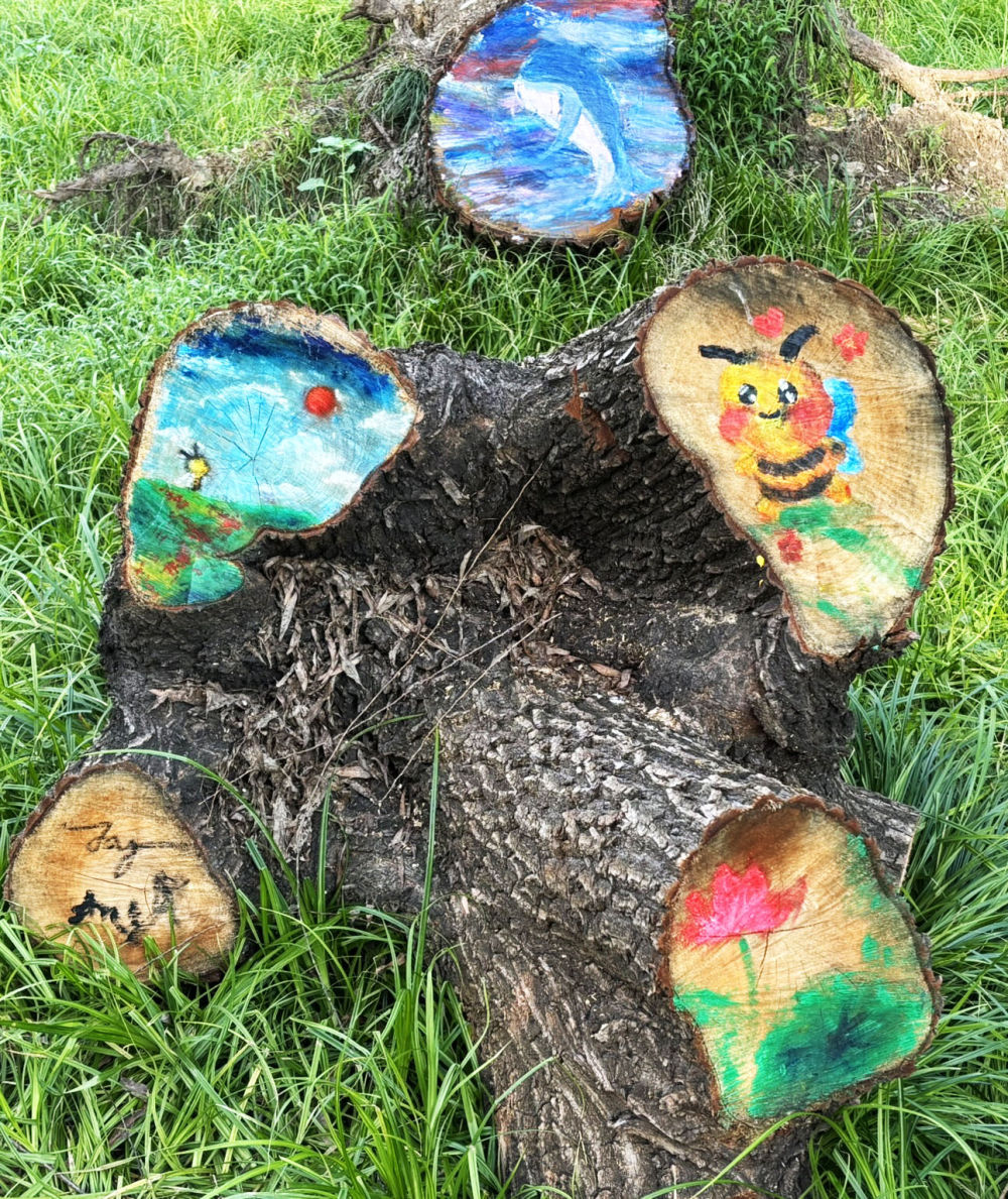 对于不同的地面环境,孩子们有不同的构思。有的树桩截面下是草坪,他们就抹几丛草、描几株花,活脱脱似地上花草长高挡在了截面上。嫩草茂密处是小羊白兔,枝枝杈杈下是小熊松鼠,空旷辽阔处是美丽彩虹……还有更多“抽象派”“印象派”手笔,想要搞明白,你得有丰富想象力。