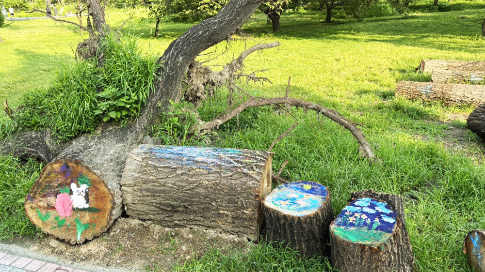 就这样,不久前的一片狼藉,变身为一个倒伏乔木的美术小广场。一度摇头叹息的游人十分惊喜,或忙不迭地用手机拍照,或请人拍摄自己与树桩画的合影。有的把照片发到微信群、朋友圈,有的干脆呼朋唤友一起来观看,还指指点点感慨:“理念一变,废物变宝,坏事变好”“大树倒了也能变漂亮!不要怕挫折”……见闻着这些场景,我和同伴们忽若有了些“网红”的感觉。