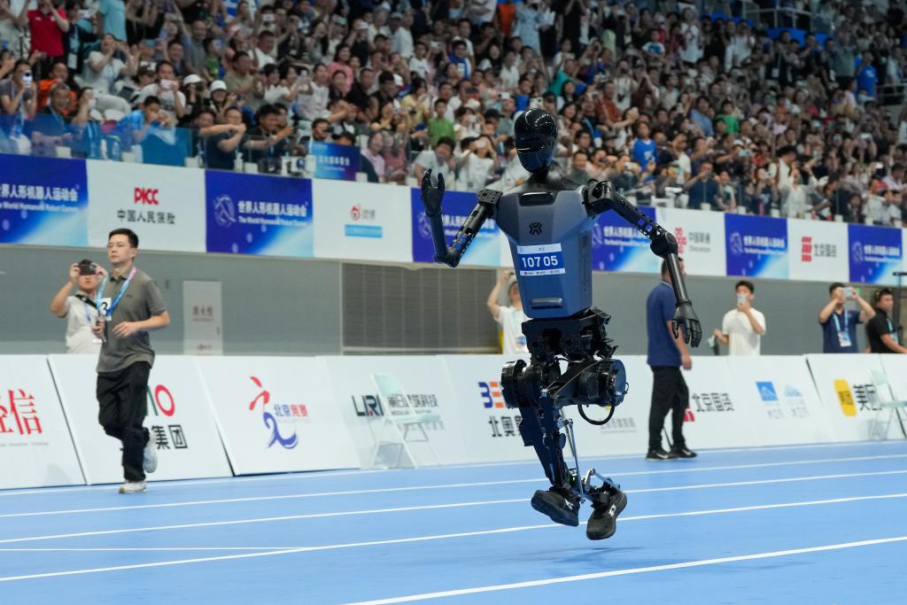 8月17日,在世界人形机器人运动会100米决赛中,天工队的人形机器人在奔跑。新华社记者 鞠焕宗 摄
