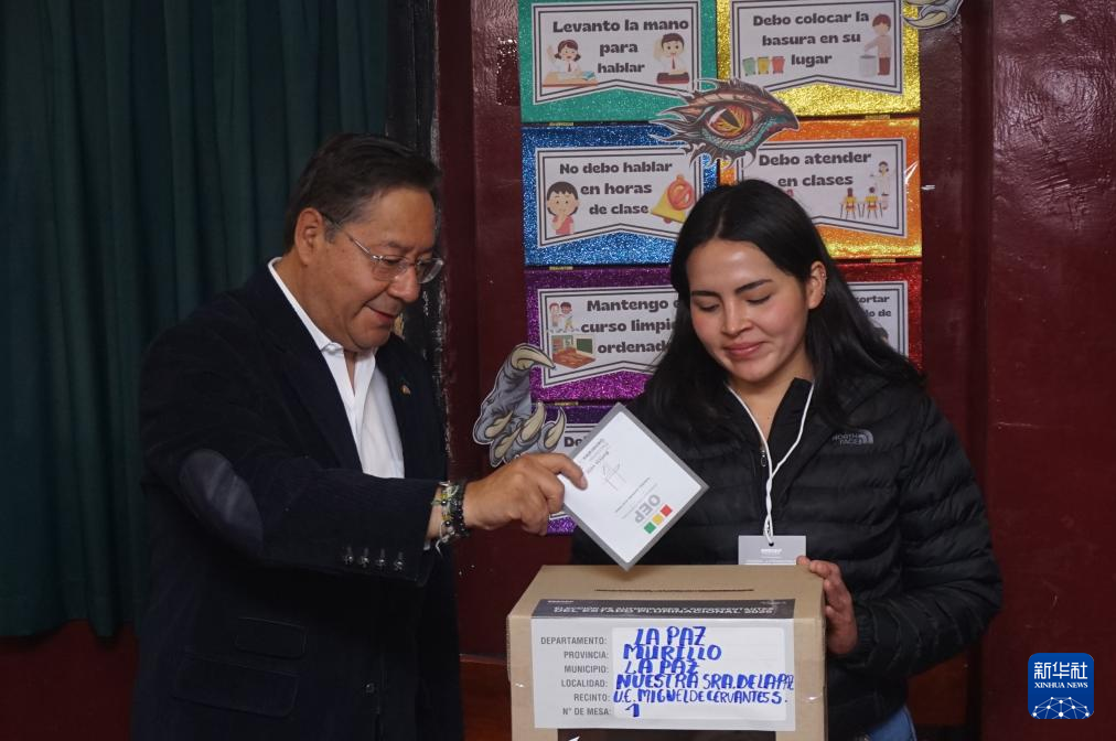 8月17日,在玻利维亚首都拉巴斯的一处投票站,现任总统阿尔塞(左)参加投票。新华社发(哈维尔·马马尼摄)