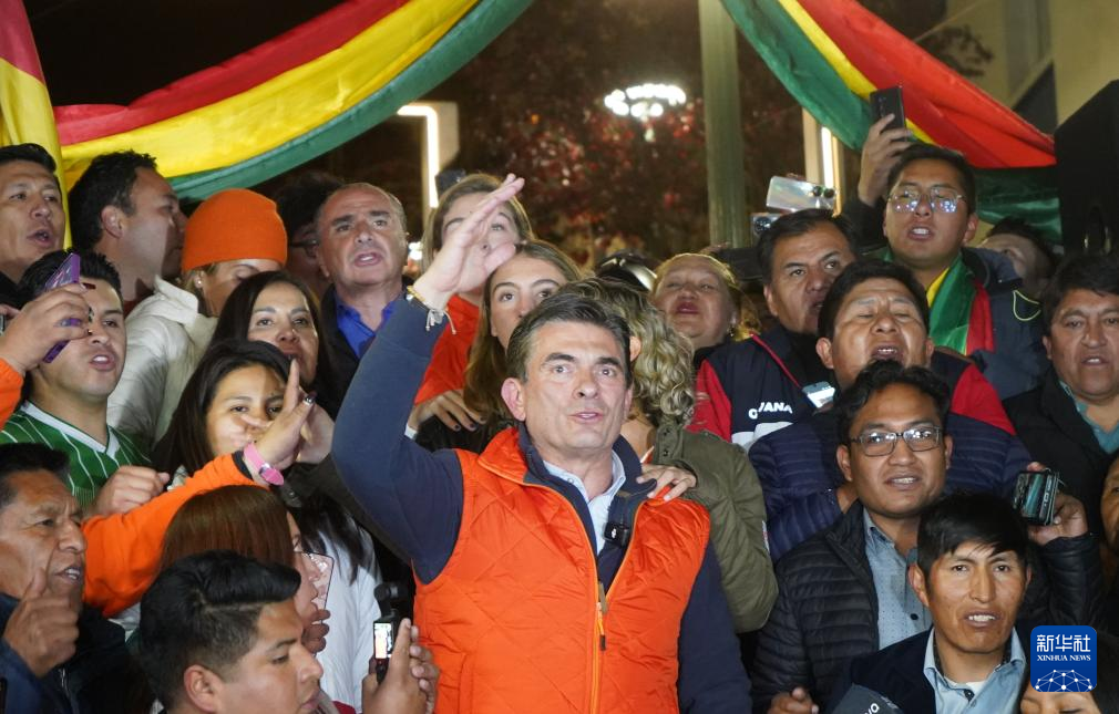 8月17日,玻利维亚基督教民主党候选人罗德里戈·帕斯·佩雷拉(前中)在首都拉巴斯发表演讲。新华社发(哈维尔·马马尼摄)