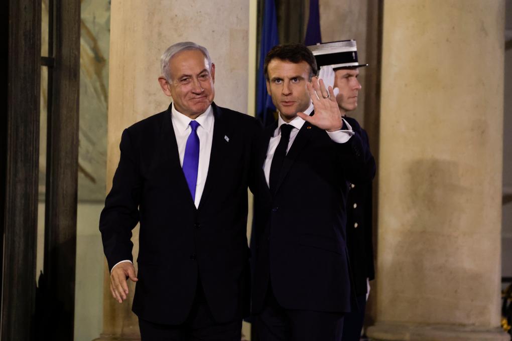 2023年2月2日,法国总统马克龙(右)在巴黎总统府爱丽舍宫迎接来访的以色列总理内塔尼亚胡。新华社发(里特·埃斯摄)
