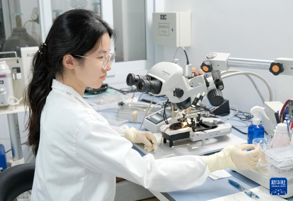 8月20日,研究人员在北京大学未来技术学院实验室准备给小鼠注射荧光标记物。新华社发