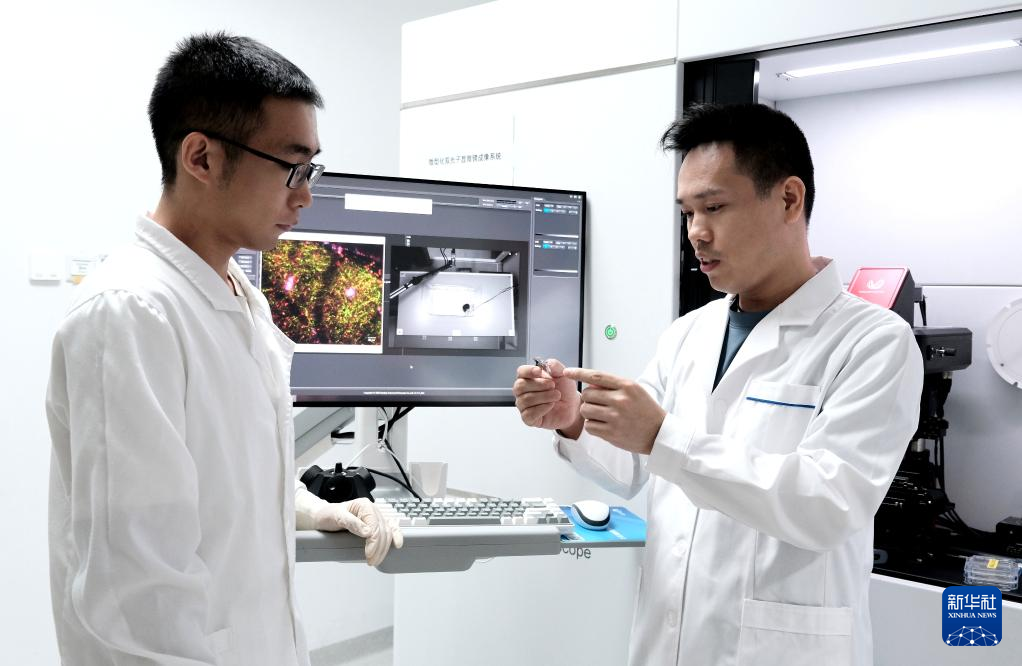 8月20日,吴润龙(右)与学生在北京大学未来技术学院实验室讨论多色微型化双光子显微镜的应用。新华社发