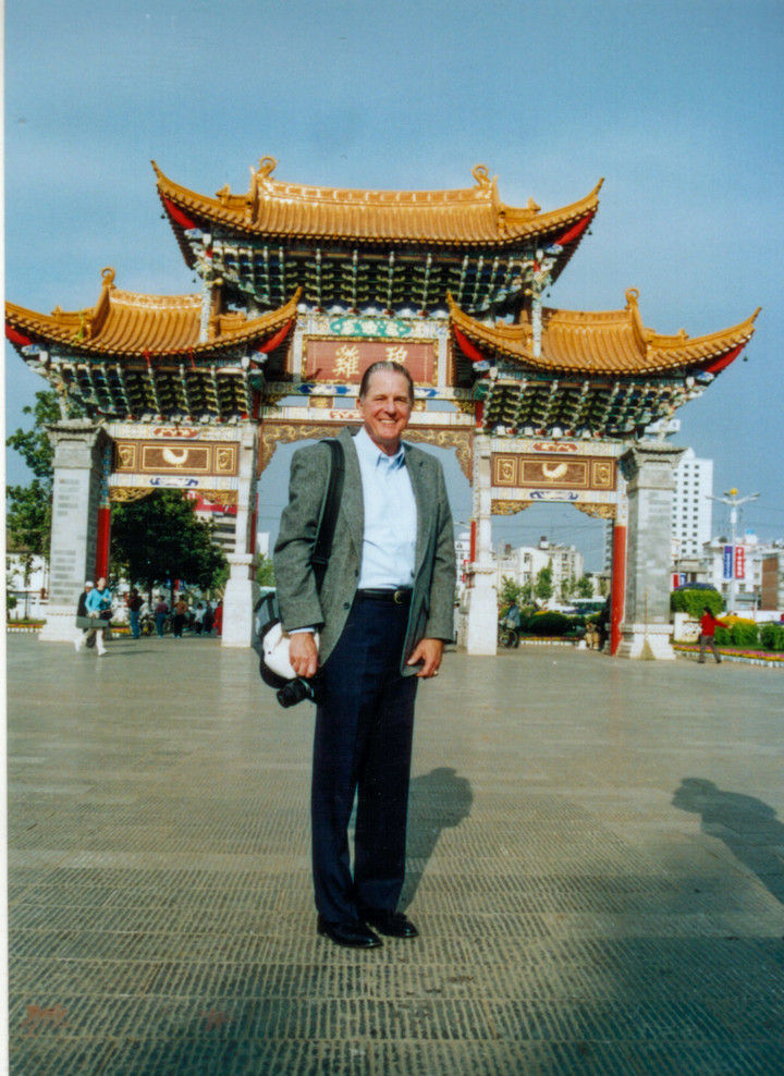 2003年3月,史迪威将军的外孙约翰·伊斯特布鲁克来到“史迪威公路终点站”——昆明碧鸡牌坊。新华社发