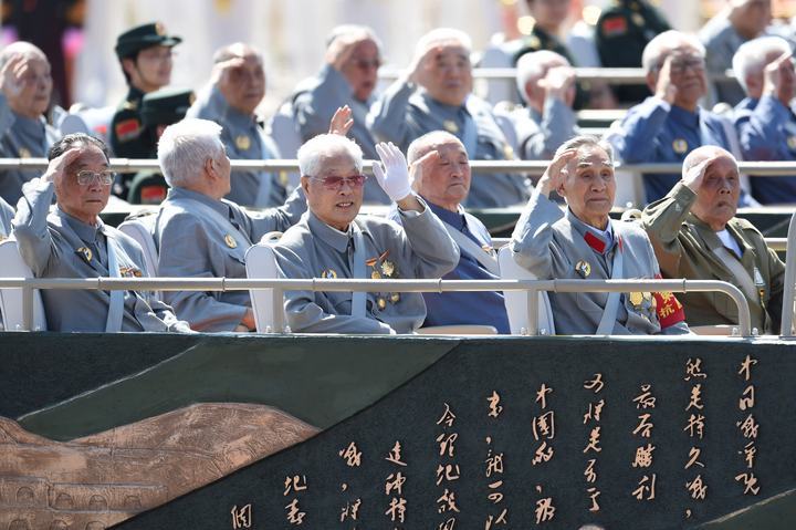 2015年9月3日,中国人民抗日战争暨世界反法西斯战争胜利70周年纪念大会在北京隆重举行。这是抗战老兵乘车方队通过天安门广场。新华社记者申宏摄