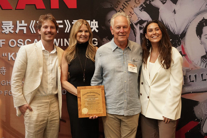 6月24日,在美国洛杉矶,《苦干》摄影师斯科特的儿子马克·斯科特(右二)在首映前与家人合影。新华社发