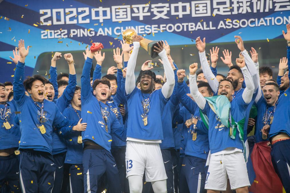 2022年12月31日,武汉三镇队球员在颁奖仪式上庆祝夺得中超冠军。新华社记者 伍志尊 摄