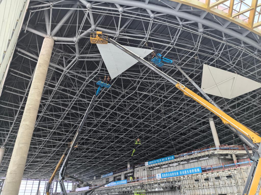 “咔嚓”,随着两块蜂窝金属铝板精准扣接,P6施工区的各吊顶模块紧紧相扣,为“凤凰”腹部覆盖上精美坚固的“银甲”。
