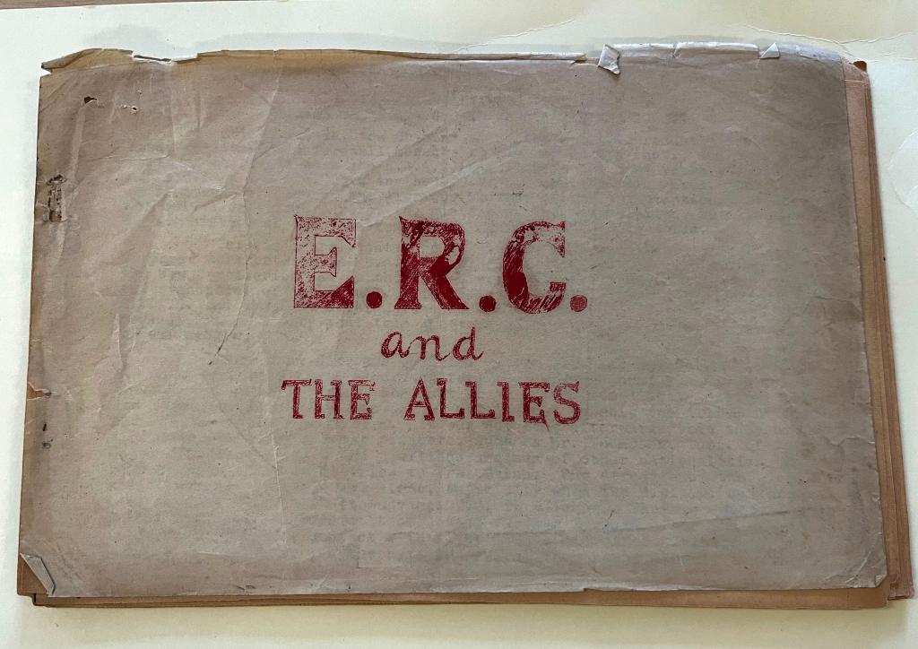 这是一本普通信纸大小、纸张泛黄发黑的笔记,封面用红字写着《东江纵队与盟军》。这份档案未经装订,只用别针夹着,页边已脆化。