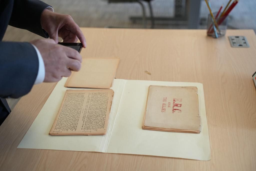 这是8月21日在位于英国曼彻斯特市的人民历史博物馆拍摄的由曾参加东江纵队的新华社伦敦分社首任社长黄作梅主笔编撰的东江纵队援救盟军人员的档案资料。(新华社记者吴黎明摄)