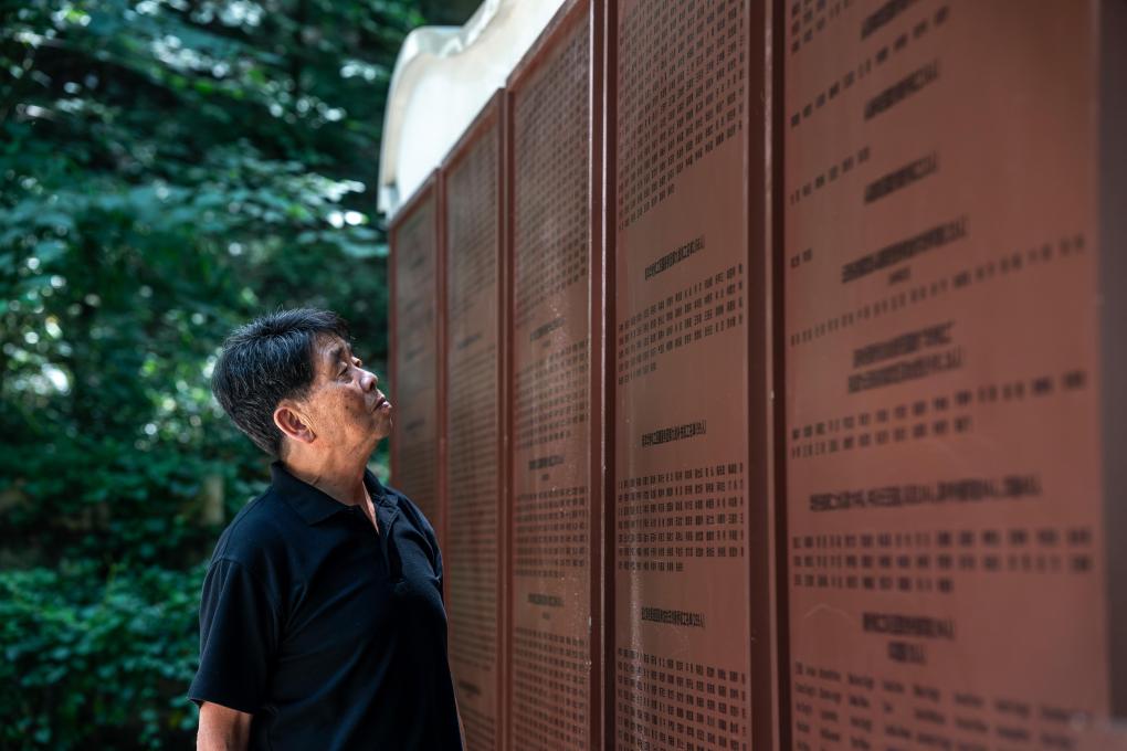 2025年7月18日,在昆明市西山森林公园,张云鹏凝视南侨机工英名录墙上父亲的名字。