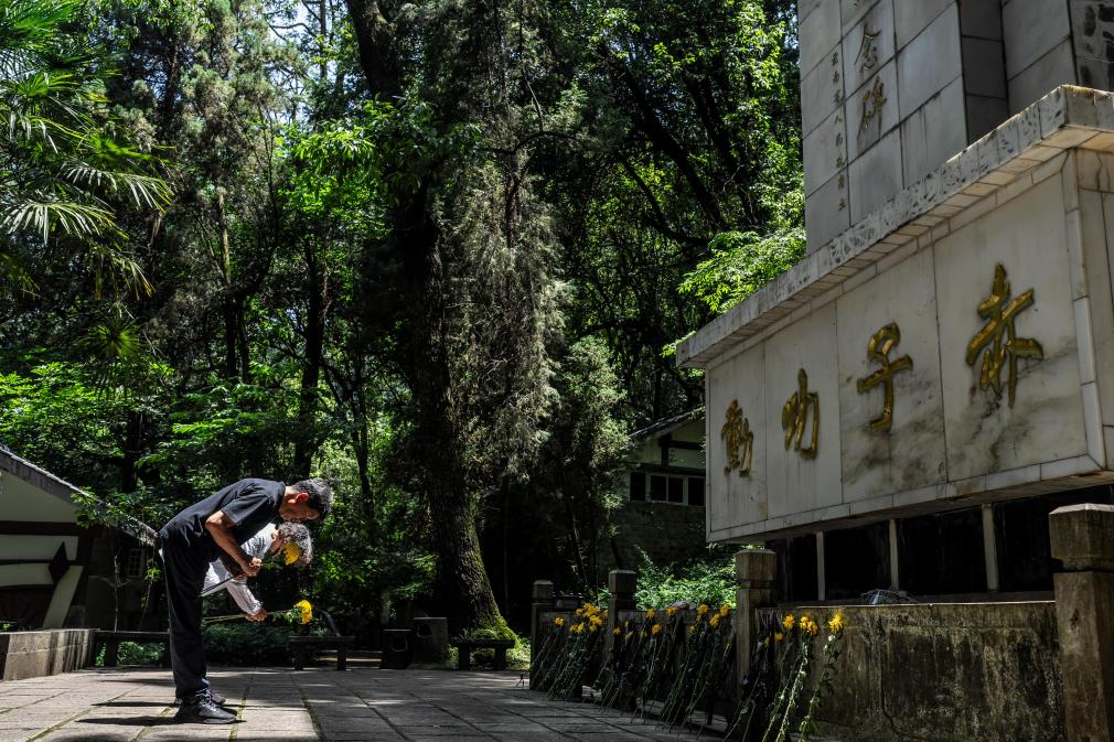 2025年7月18日,在昆明市西山森林公园,张云鹏(前)和妹妹张昆玉向南洋华侨机工抗日纪念碑鞠躬。