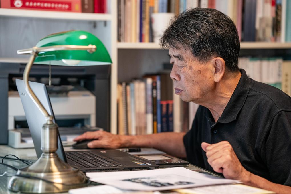 2025年7月17日,张云鹏在书房整理南侨机工相关资料。