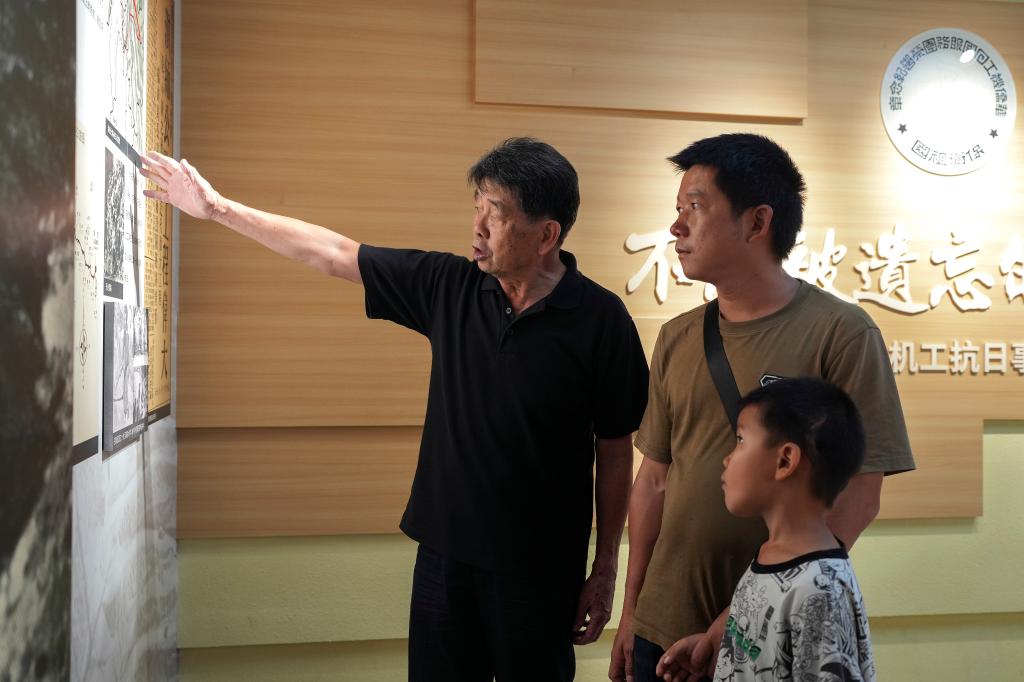 2025年7月18日,在昆明市博物馆南侨机工分馆,张云鹏(左)为参观的游客讲述南侨机工的故事。