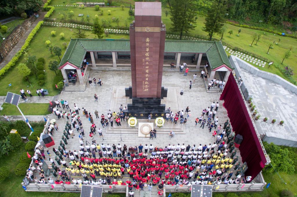 2017年7月7日,各界人士在云南省瑞丽市畹町镇南洋华侨机工回国抗日纪念碑前唱国歌,祭奠先烈。