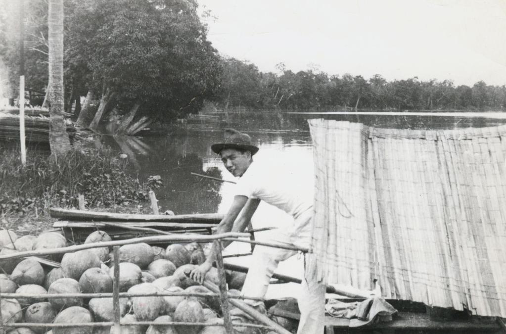 1938年,张智源在马来半岛装运椰子。 新华社发
