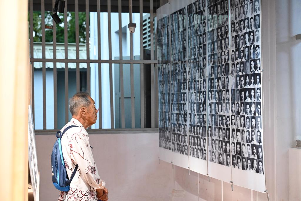 2025年8月14日,在刚揭幕的马来西亚吉隆坡南侨机工纪念馆内,一名老人观看南侨机工照片墙。 新华社记者 程一恒 摄