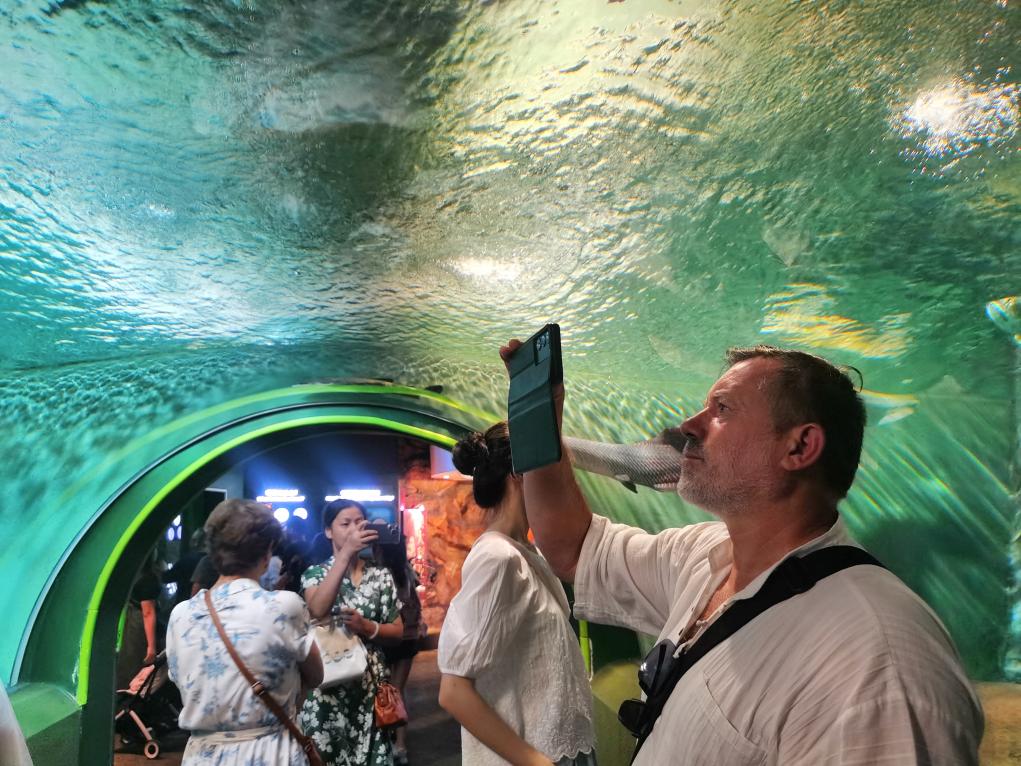 8月27日,一名外国游客在上海海洋水族馆参观。新华社记者 陈爱平 摄