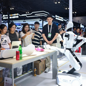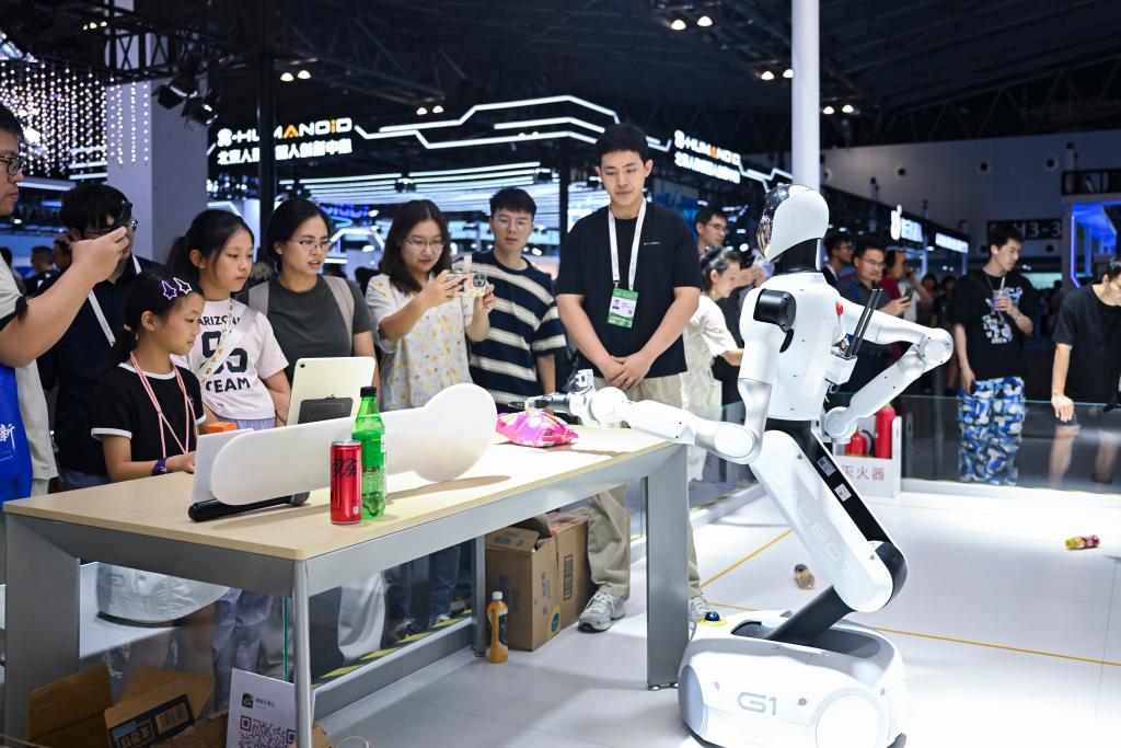 在2025世界人工智能大会展览现场,参观者在观赏一款可用于零售、工业等多种场景的机器人(2025年7月29日摄)。新华社记者 陈浩明 摄