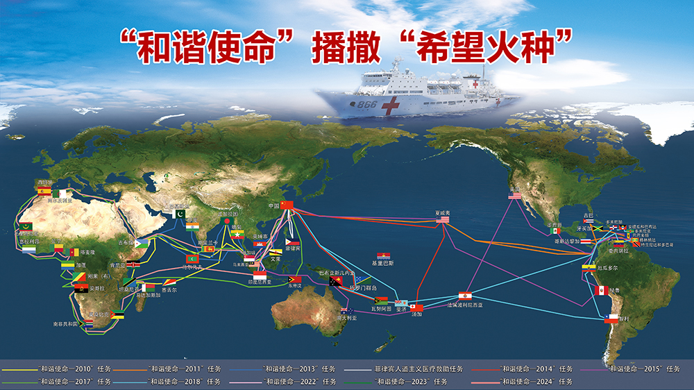 Zhang Xiaogang: With the spirit of benevolence, PLAN hospital ship Ark Peace has completed 10 iterations of Mission Harmony since 2010. It has sailed over 320,000 nautical miles and visited 52 countries, spanning three oceans and six continents. The ship has provided medical service to more than 370,000 people. With great love and compassion, it has sown the “seed of hope” and forged deep bonds with the peoples of the countries it visited. Going forward, the PLA Navy will continue to carry out Mission Harmony, provide high-quality public security goods with more “arks of life”, and write a heart-warming chapter on implementing the Global Security Initiative and building a maritime community of a shared future.