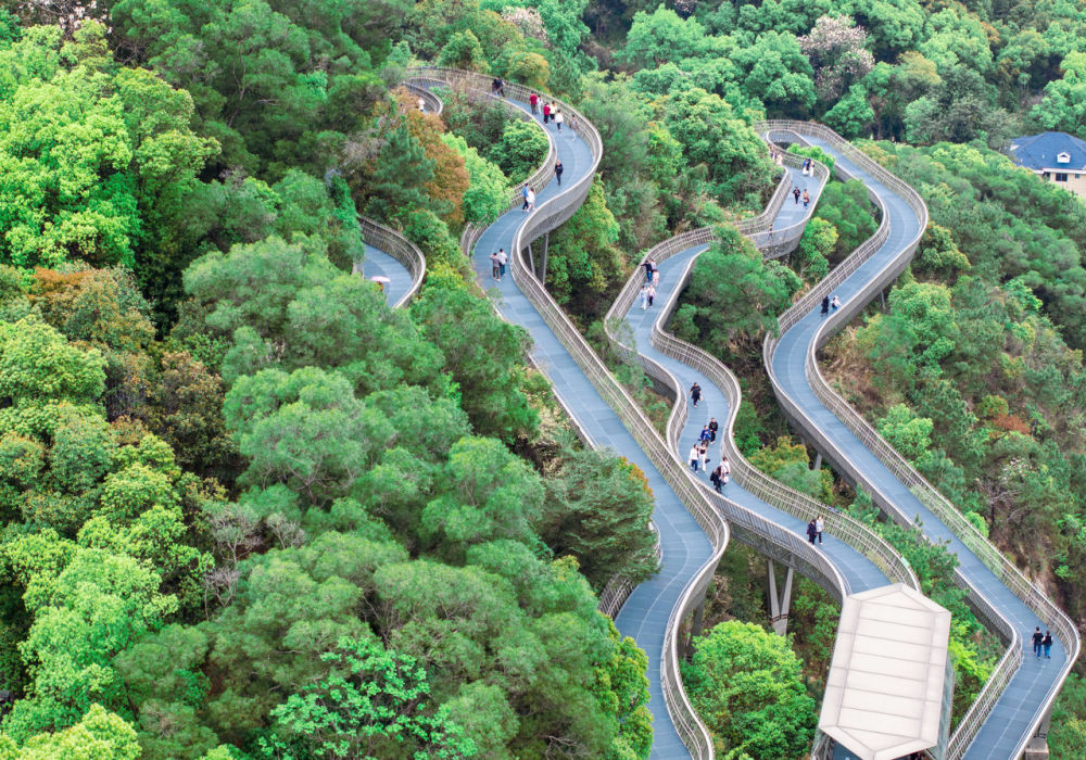 闹市之中、葱茏之间,腾起一条串联福州五大公园、全长约19公里的“福道”。它是国内最长的空中森林步道,设计师王文奎说:“我们尽心呵护每一棵树、每一块石头,采用独特的钢架镂空设计,让阳光能透过栈道洒向大地,让雨水能顺着缝隙滋养草木,让‘福道’成为人与自然对话的纽带。”