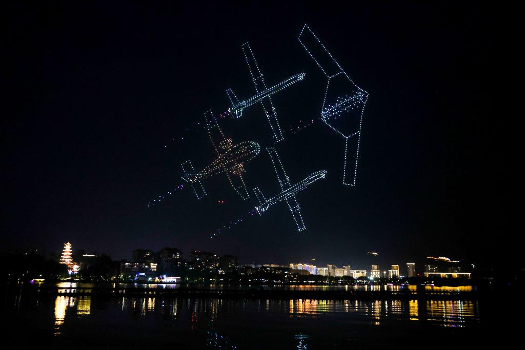 这是7月11日晚在重庆市梁平区双桂湖国家湿地公园拍摄的无人机表演。新华社记者 黄伟 摄