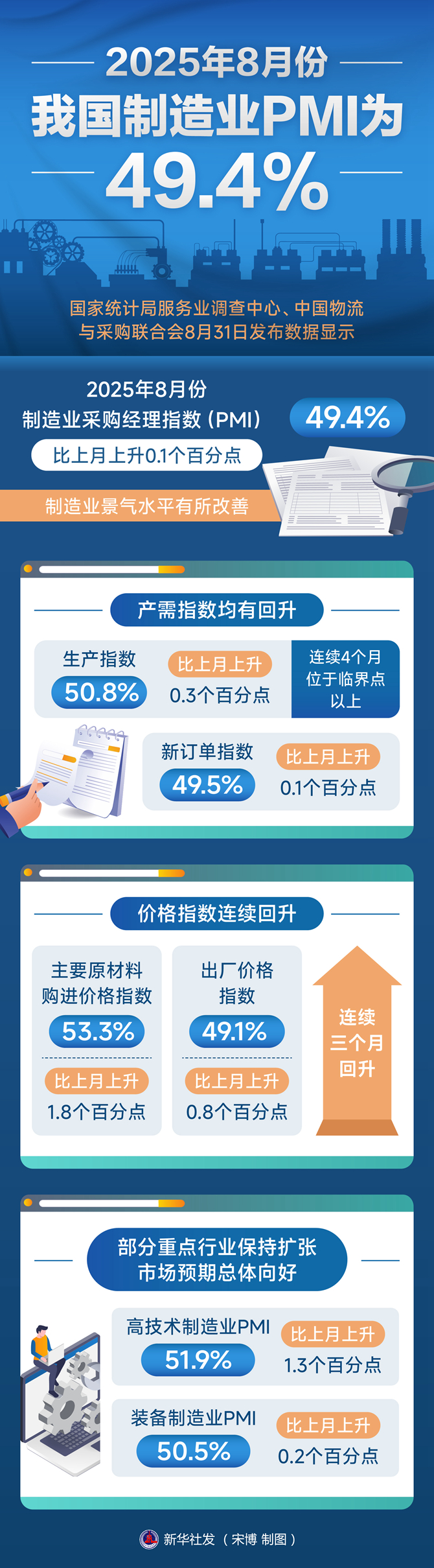 新华社北京8月31日电(记者王雨萧)国家统计局服务业调查中心、中国物流与采购联合会31日发布数据显示,8月份制造业采购经理指数(PMI)为49.4%,比上月上升0.1个百分点,制造业景气水平有所改善。